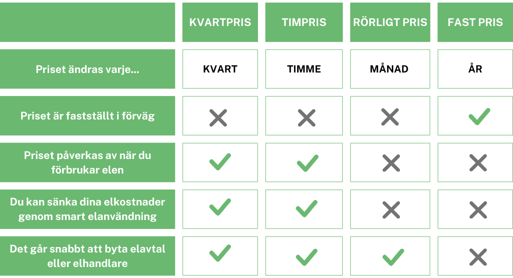 Bilden ovan visar en jämförelse mellan olika typer av elavtal: kvartpris, timpris, rörligt pris och fast pris. Den förklarar hur ofta priset ändras, om priset är förutbestämt, om elpriset påverkas av ditt elanvändningsmönster, om du kan sänka elkostnader genom smart elanvändning och om du kan byta avtal med kort varsel.